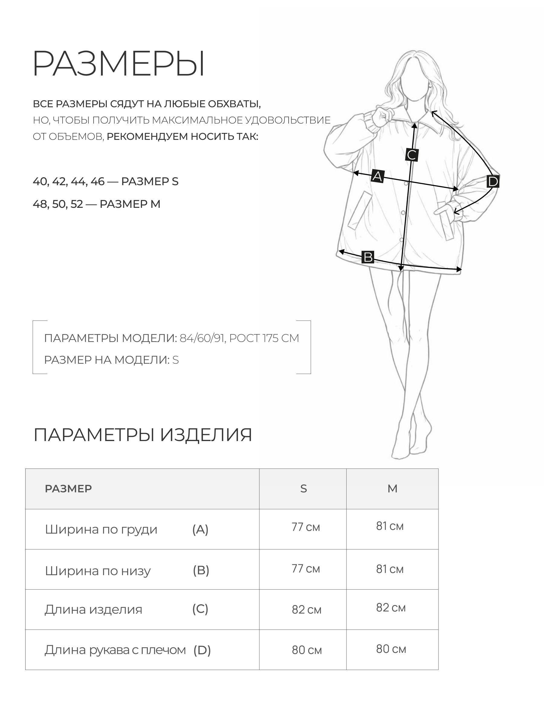 Параметры модели: ОГ 84 см, ОТ 60 см, ОБ 91 см. Рост 175 см. На модели размер S (OVERSIZE)