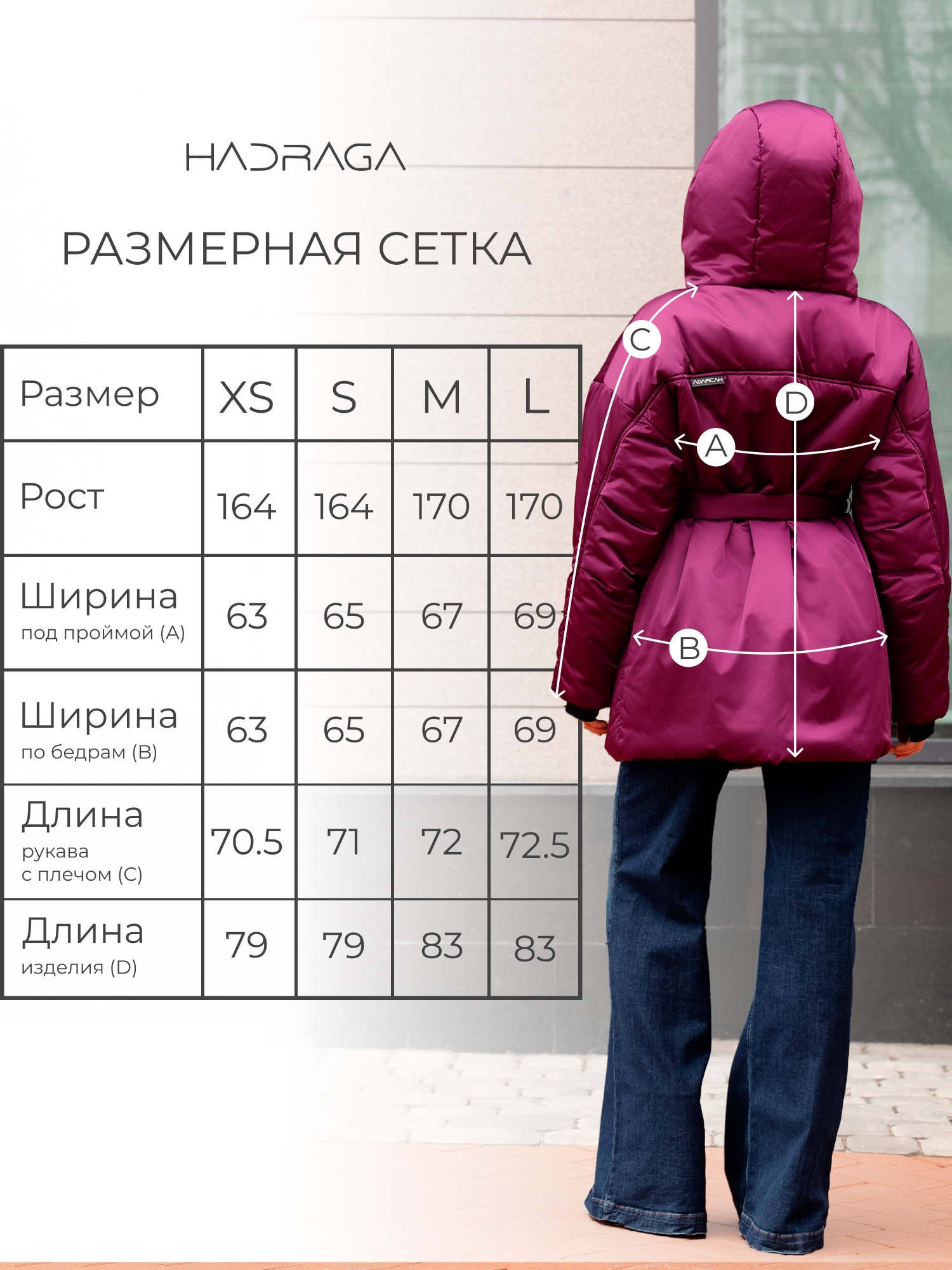 Объёмный силуэт, пояс на талии и высокий капюшон создают комфорт и защищают от холода. Идеальна для межсезонья и зимы — подходит для температуры от +10°C до -10°C.