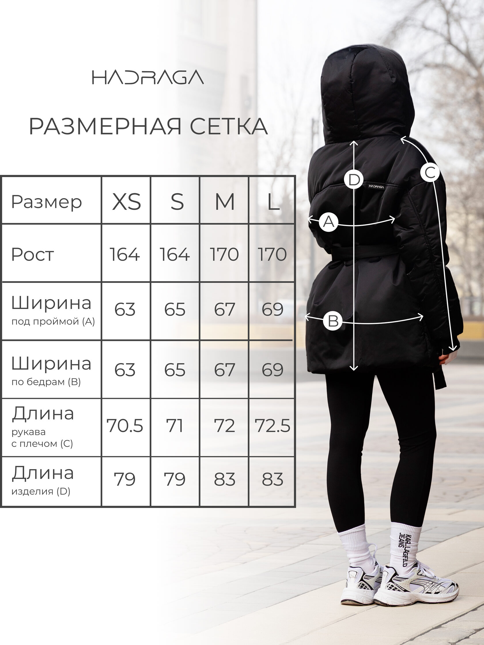 Объёмный силуэт, пояс на талии и высокий капюшон создают комфорт и защищают от холода. Идеальна для межсезонья и зимы — подходит для температуры от +10°C до -10°C.